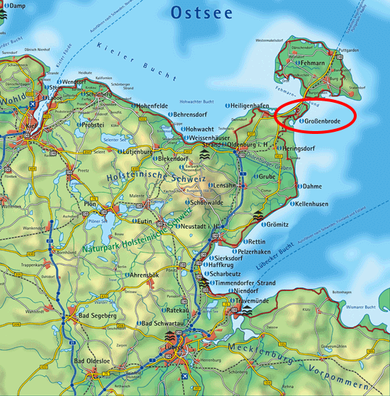 Die A1 führt von Hamburg über Lübeck nach Norden in Richtung der Insel Fehmarn. Kurz hinter Heiligenhafen endet sie und wird zur B207 (E47). Jetzt sind es nur noch 5 km, bis es kurz vor der Fehmarnsundbrücke rechts ab geht nach Großenbrode. Von Hamburg erreicht man Großenbrode mit dem Auto in etwa 1 1/2 Stunden.