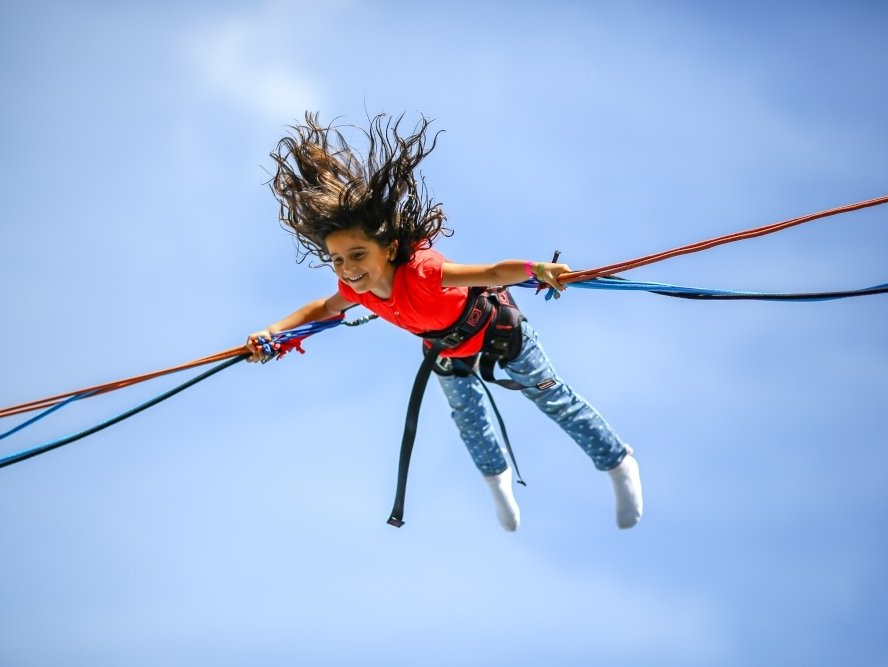 Action am Strand bieten auch die Bungee-Jumping- und die achter Trampolinanlage: Hier werden die tollsten Luftsprünge gemacht.