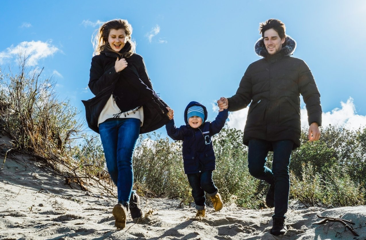 Das Strandvergnügen kennt trotzdem keine Pause! Die Kinder tollen im Sand, bauen Gräben und Staudämme. Dick eingemummelt, mit Matschhose und Gummistiefeln ausgestattet, macht es besonders Spaß.